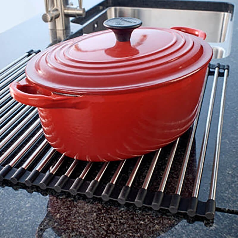 The sturdy stainless-steel construction with 100% food-safe silicone coating can hold your heaviest cookware with a weight capacity of 100 lbs. This roll-up dish rack is dishwasher-safe and easy to clean.