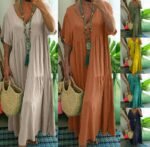 With its flattering V-neck and loose fit. this dress suits all body types. It is available in different colors and in regular size and has a floor length. for an elegant and casual look.
